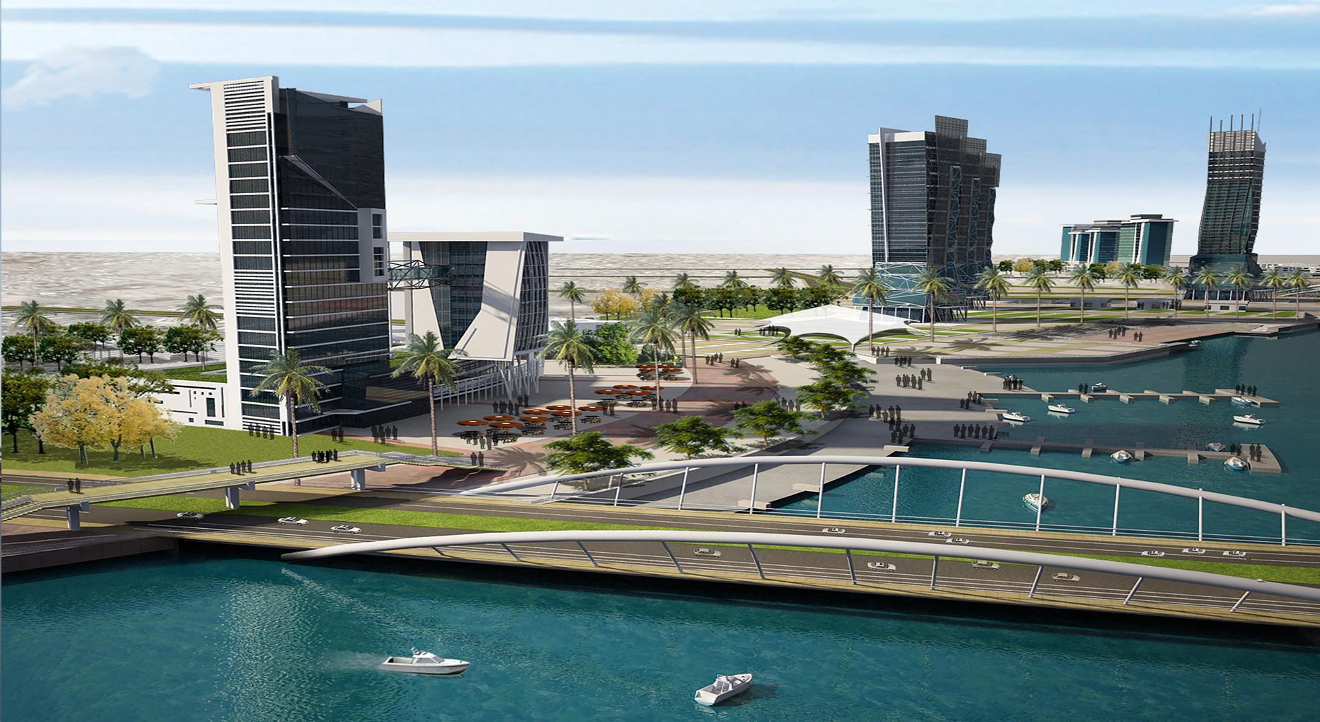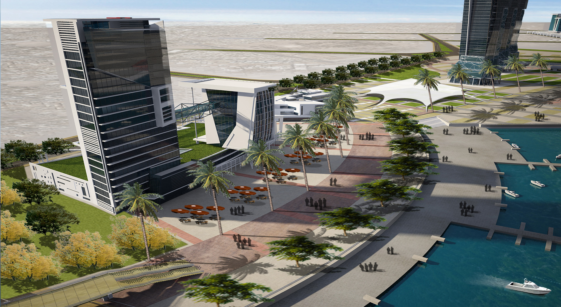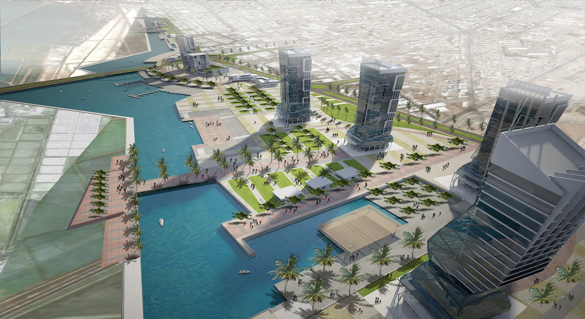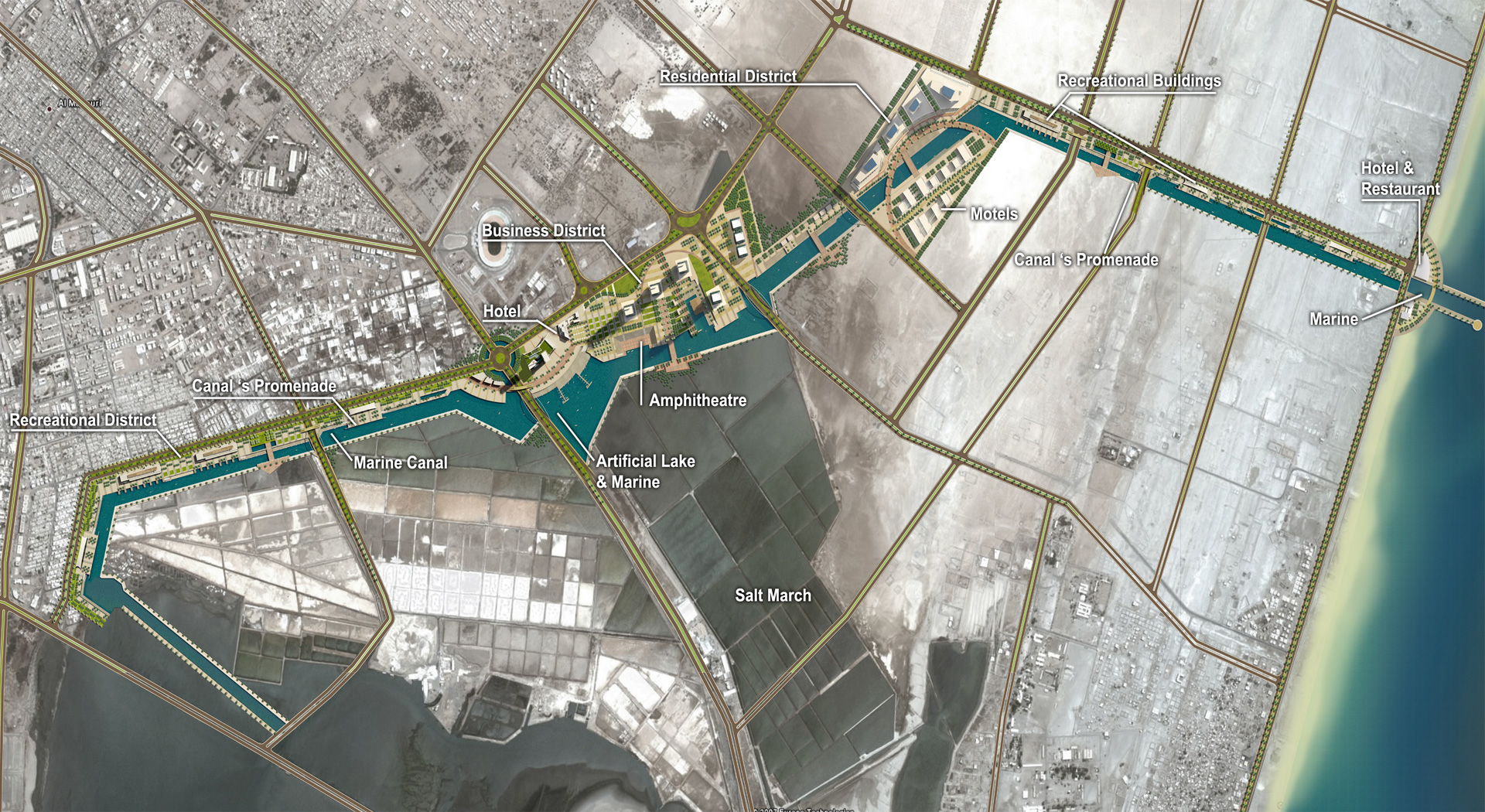 An Artificial Canal Passing through the Project's land was added in order to increase the land was added in order to increase the land value of the Aden Marina Canal and creating a water front promenade, which Consists of different levels, green spaces and piazzas. It also includes administrative towers, residential buildings, cafeterias, commercial spaces and a number of marinas and urban spaces located along the canal.
