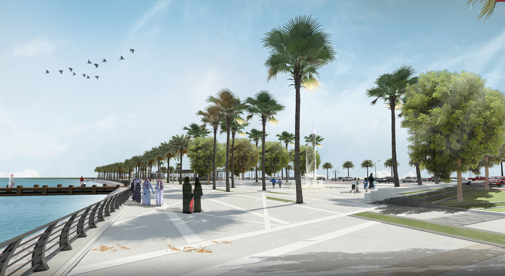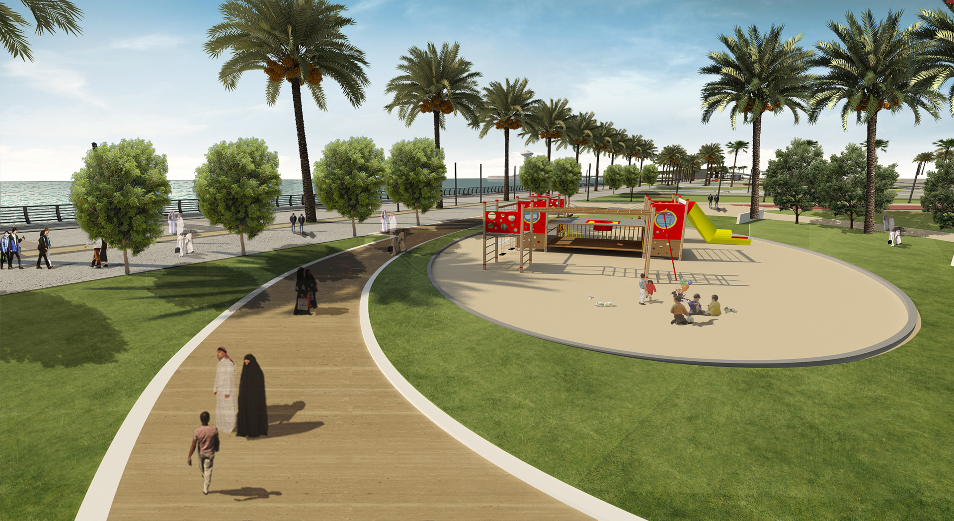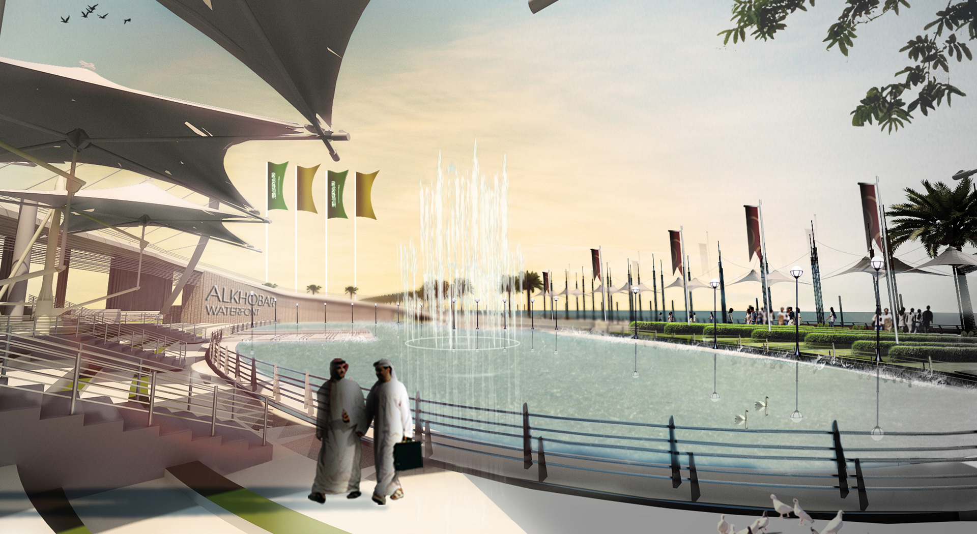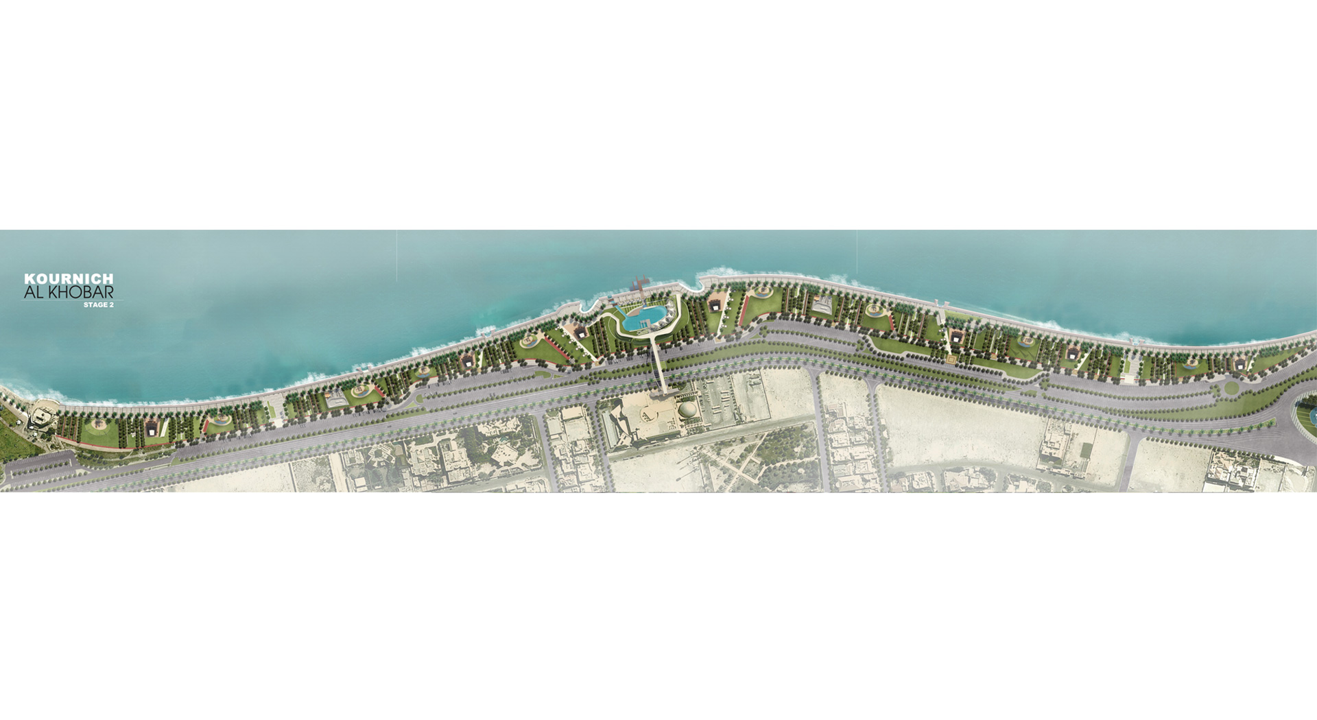 The Corniche Landscape Project is a major revitalizing urban project, located on the Al-Khobar waterfront. The Corniche will serve as a symbolic element of the city of Al-Khobar reigniting the public outdoor life activities along the sea coast. Spanning a distance of more than 70 km, The Corniche Project will act as a social Nexus and a cultural and touristic spot that a variety of activities from playgrounds to skating rings pathways and natural landscapes. Along with these outdoor activities a range of retail outlets, cafes and restaurants are located on the urban waterfront to accommodate visitors and passersby's. A strong integration is created between landscape and topographic elements and its sharp axial lines create a strong sense of direction and movement.